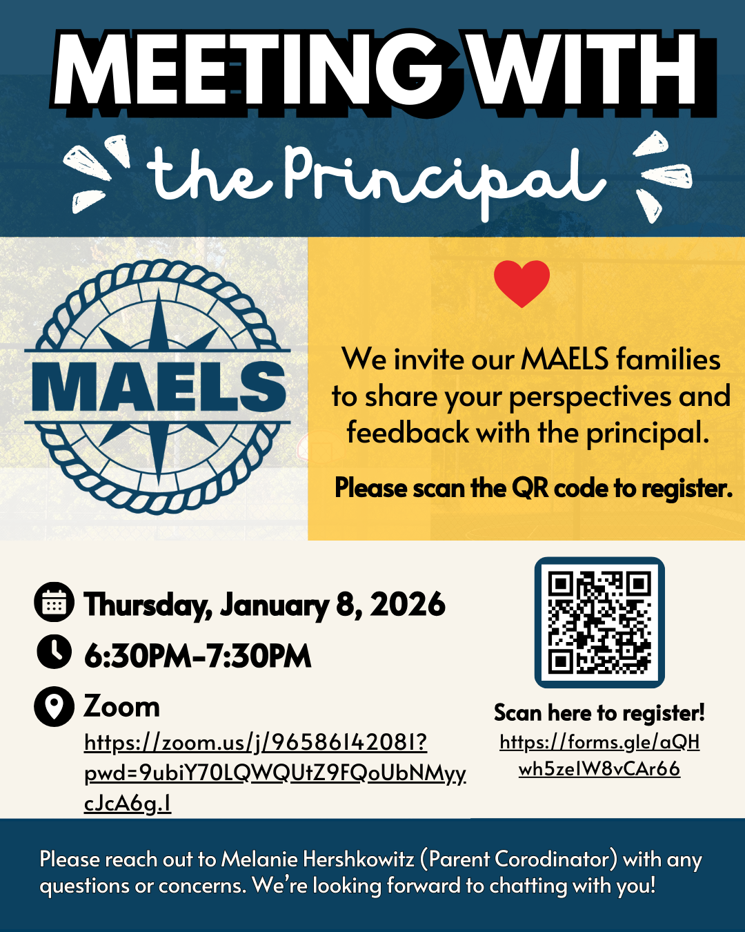 We invite our MAELS families to share your perspectives and feedback with the principal on Thursday, January 8th, 2026